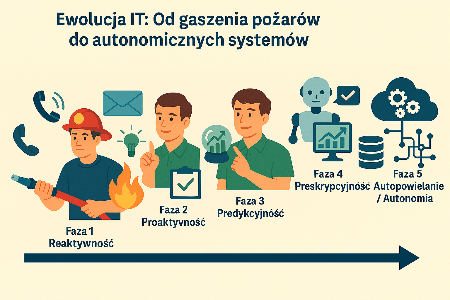 Świat IT przeszedł głęboką transformację – od roli „pogotowia ratunkowego”, które przyjeżdża na sygnale, do strategicznego partnerstwa, które nie tylko zapobiega awariom, ale aktywnie kształtuje przyszłość biznesu. Ta droga ewolucji, od reaktywności do autopowielania, to nie tylko historia postępu technologicznego, ale fundamentalna zmiana filozofii działania całych organizacji. Oto mapa tej rewolucji wg. Nas.